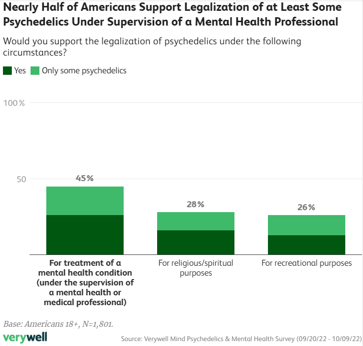 Una nueva encuesta de VeryWellMind revela que el 45% de los estadounidenses apoya la legalización de algunas sustancias psicodélicas para el tratamiento de enfermedades mentales, siempre que se administren bajo la supervisión de un profesional médico o de la salud mental.