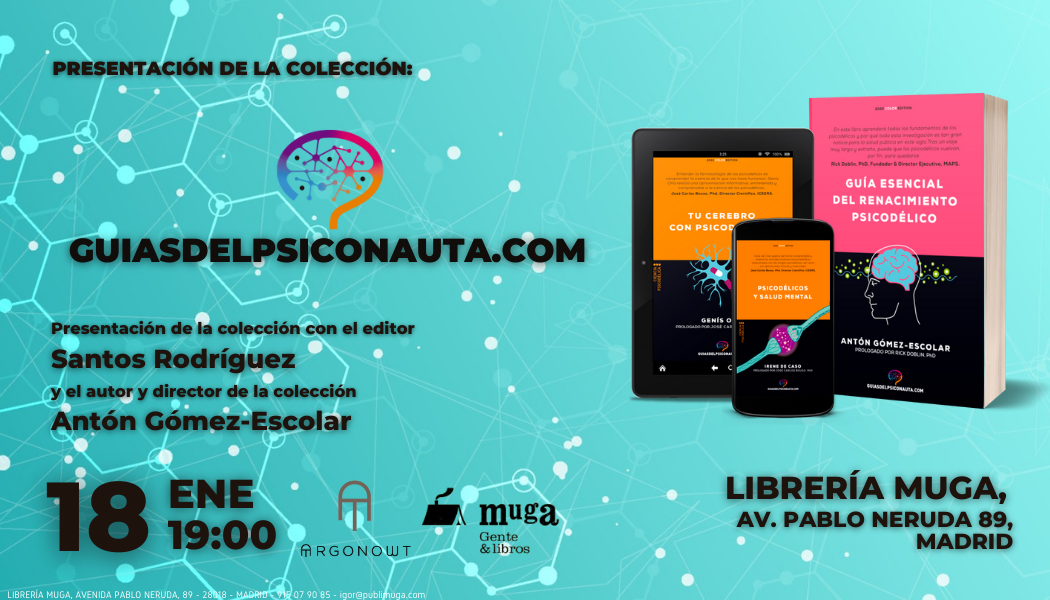 Es precisamente sobre esta temática que versará la presentación del próximo miércoles 18 de enero de la colección “Guías del Psiconauta”, en un acto en el que contaremos con la presencia del editor y fundador de la editorial, Santos Rodríguez, y el director de la colección Antón Gómez-Escolar y autor de la Guía Esencial del Renacimiento Psicodélico, psicofarmacólogo y analista científico especializado en psicodélicos, nootrópicos y otras drogas psicoactivas.