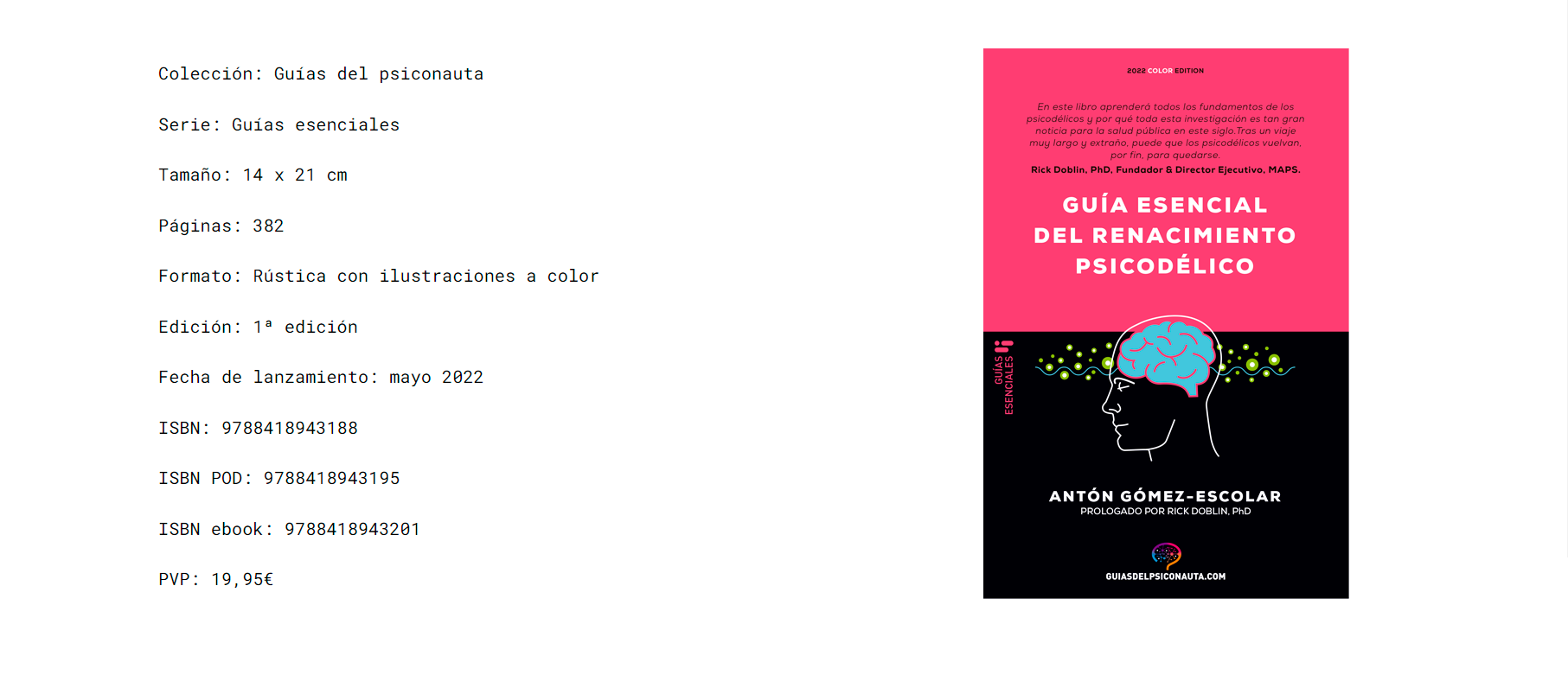 En esta guía conocerás todo lo esencial sobre la historia, neurociencia, legalidad, aplicaciones terapéuticas y reducción de daños de las drogas psicodélicas más prometedoras para la ciencia. Tras décadas de prohibición internacional, estas moléculas están volviendo a los laboratorios y clínicas, de la mano de la ciencia más rigurosa, para revolucionar la forma de entender y tratar la salud mental (depresión, ansiedad, TEPT y adicciones). Descubre el mundo de la psilocibina, la MDMA, la DMT, la ketamina y el LSD, antes de que la sociedad se sumerja en esta revolución, que cambiará para siempre la percepción que tenemos de los psicodélicos. Esta guía será de interés tanto para terapeutas y otros profesionales de la salud mental interesados en las aplicaciones clínicas, como para padres y educadores que busquen entender el impacto y la seguridad de los psicodélicos y otras drogas, así como para cualquier adulto que tenga curiosidad por conocer y explorar este nuevo mundo del renacimiento psicodélico.